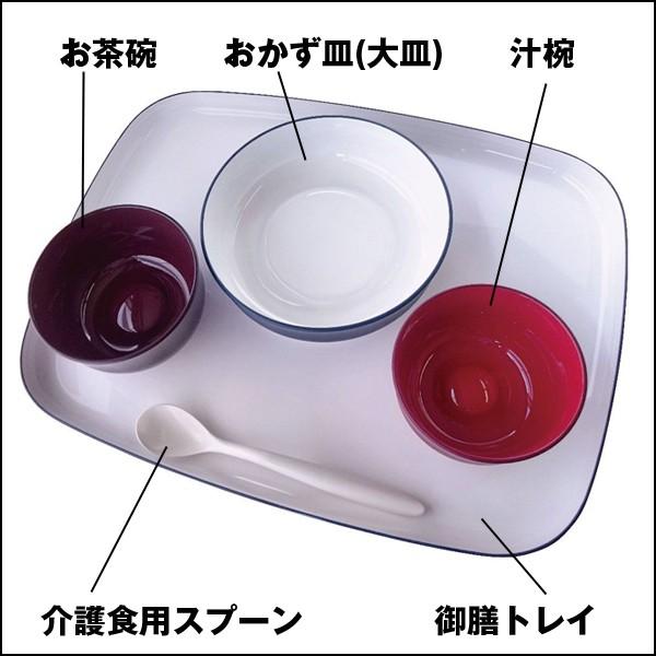 片手でも すくいやすくなっているお皿です。底に滑り止めが付いていて、お皿のふちは片側が高く、内側に丸く湾曲しているので、料理をこぼさずに楽にすくえます。